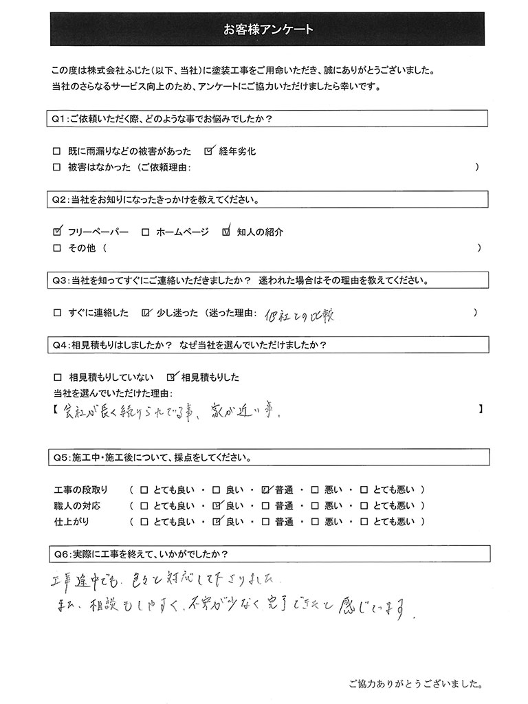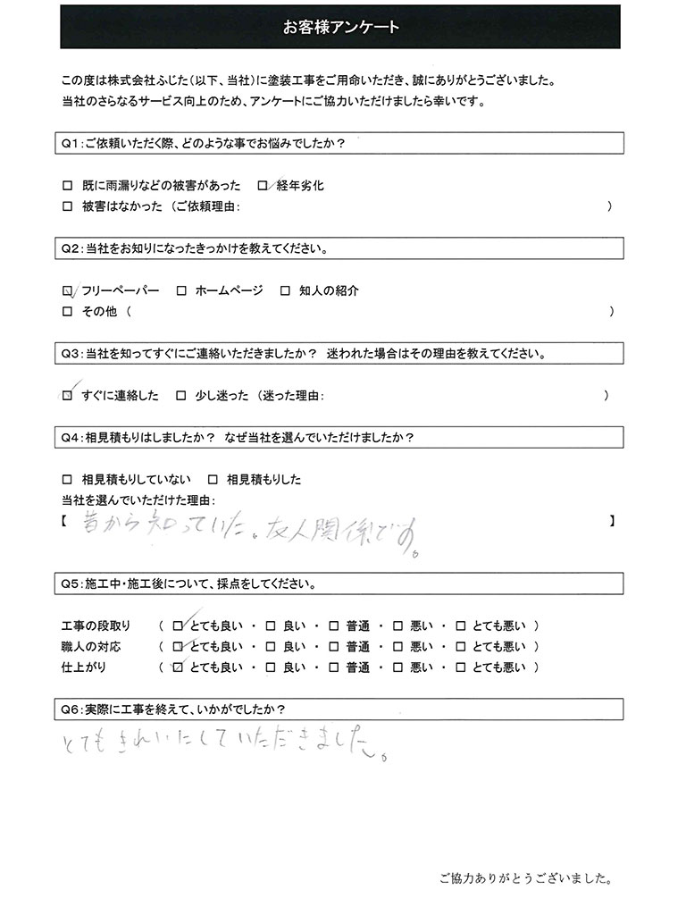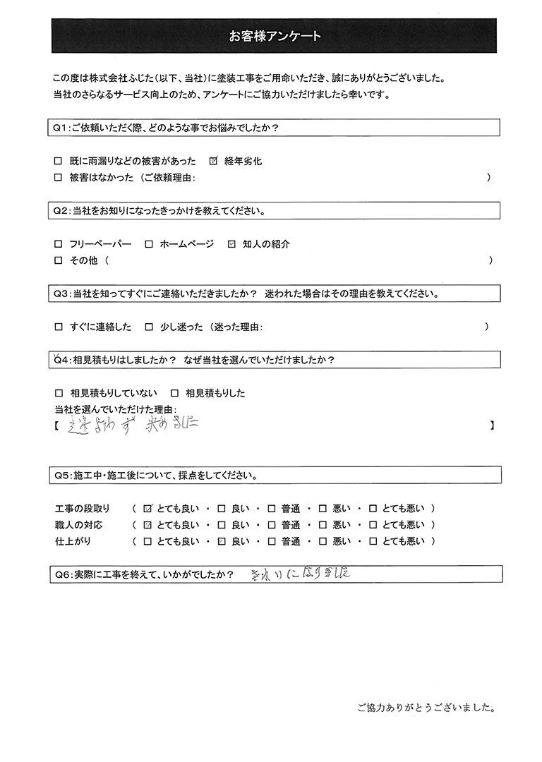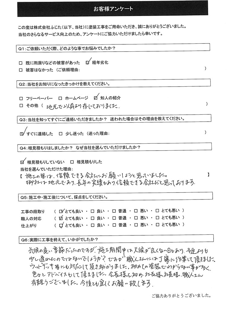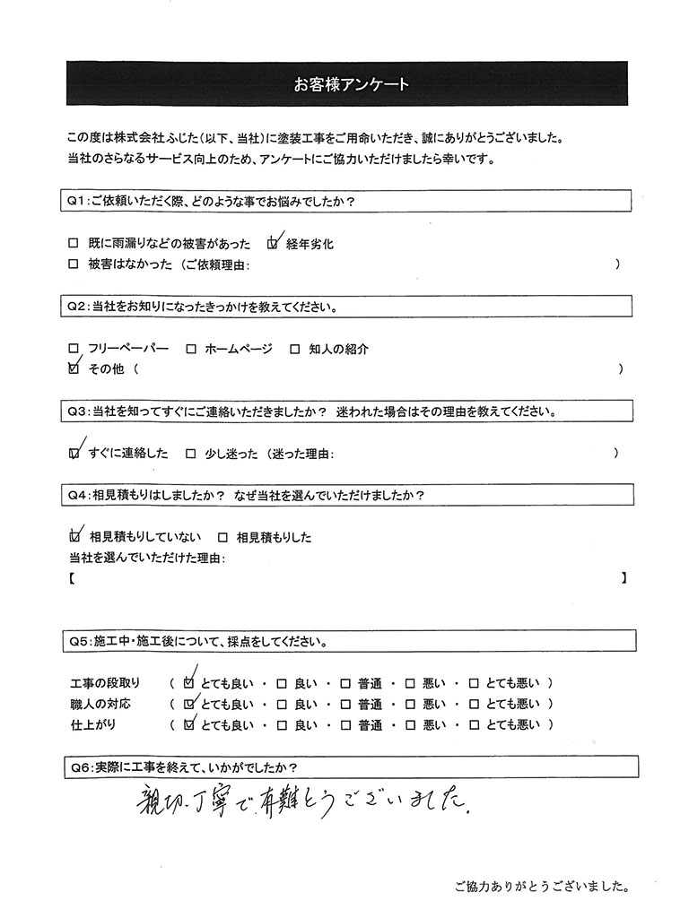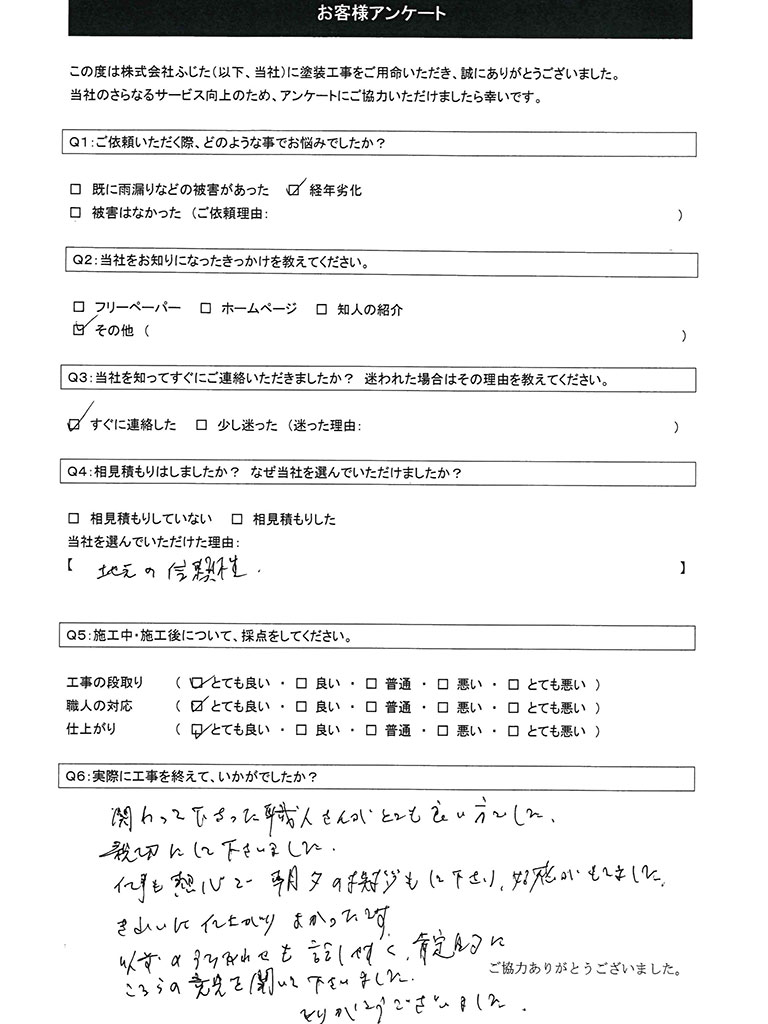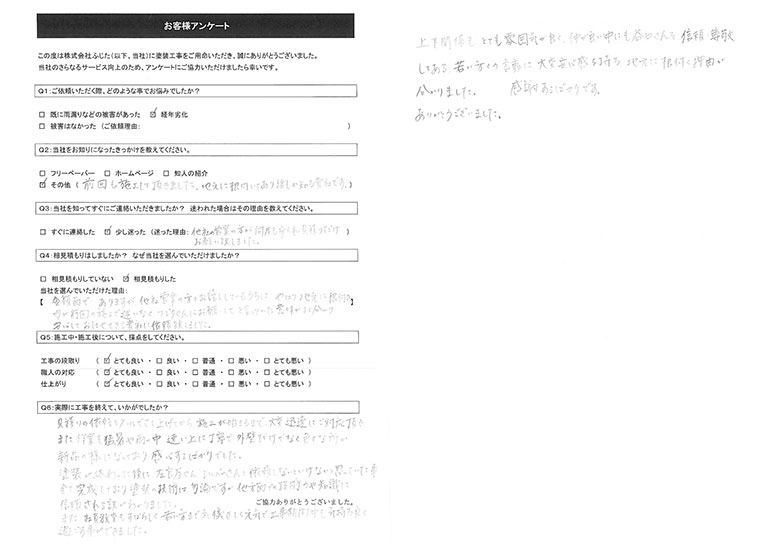 この度は数ある塗装施工業者の中から当社をお選びいただき、誠にありがとうございました。また、非常に高い評価をいただき、重ねて御礼申し上げます。